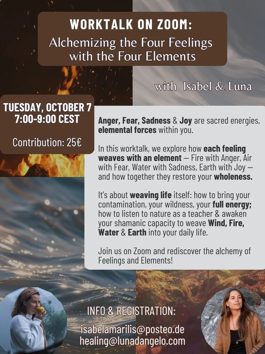 We will explore how each feeling weaves with an element — fire with anger, air with fear, water with sadness, earth with joy — and how together they restore your wholeness.